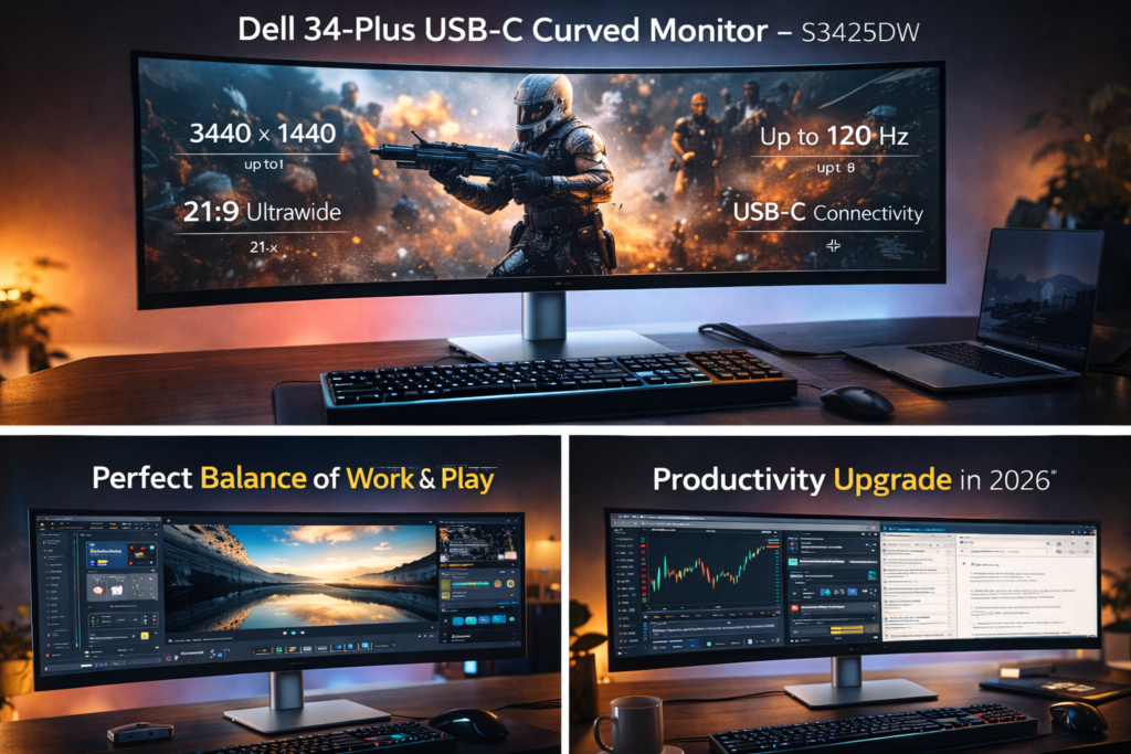 The Dell 34 Plus USB-C Curved Monitor (S3425DW) is one of the most compelling ultrawide displays currently available for professionals, creators, and gamers in the United States. With its 3440 x 1440 resolution, 120 Hz refresh rate, and immersive 21:9 curved design, it transforms how you multitask, edit, game, and consume content. Moreover, the inclusion of USB-C connectivity and wide color gamut support makes it future-ready for modern laptops and creative workflows.